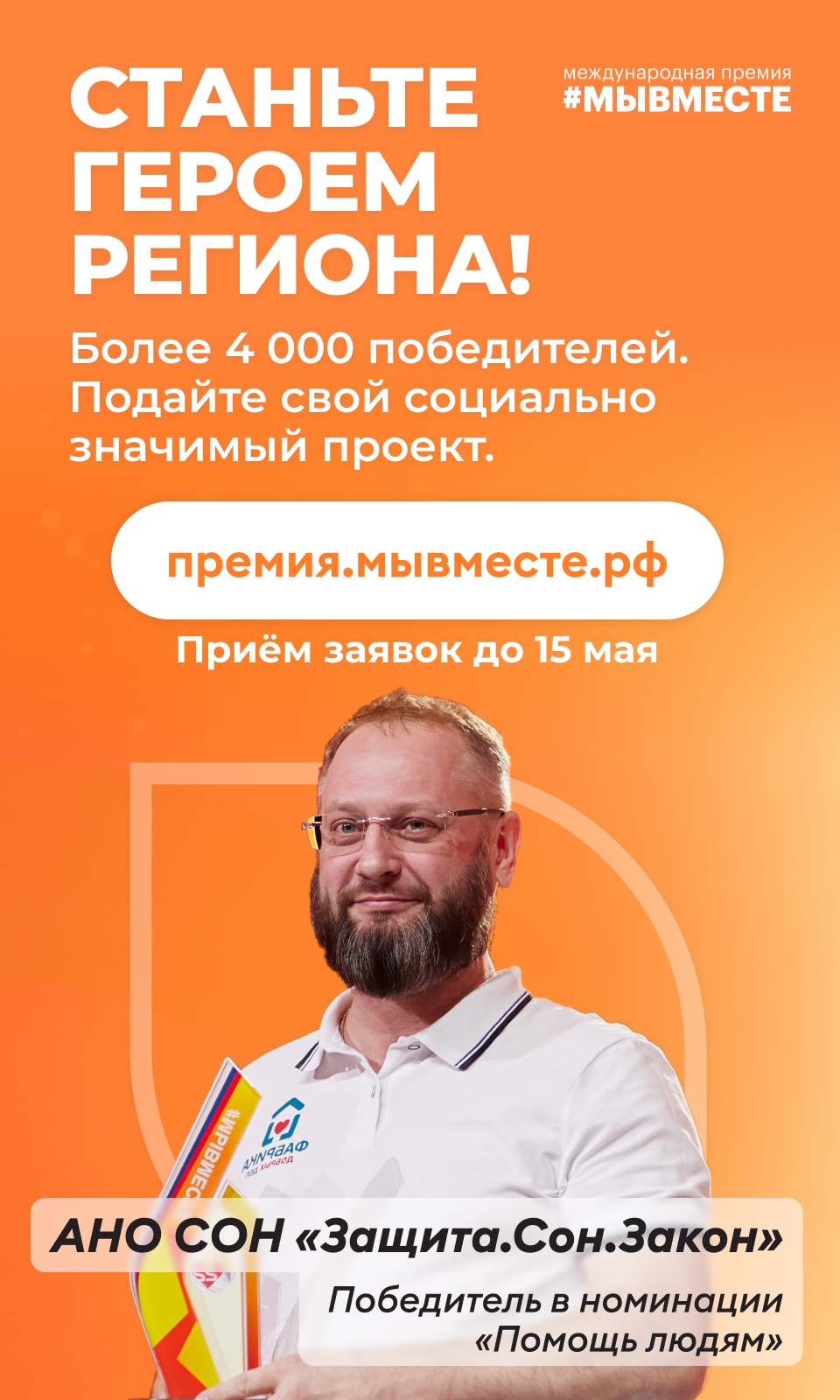 Читайте подробнее о номинациях и подавайте заявку на Премию до 15 мая на премия.мывместе.рф. Участвуйте как волонтер, НКО или бизнес-компания.