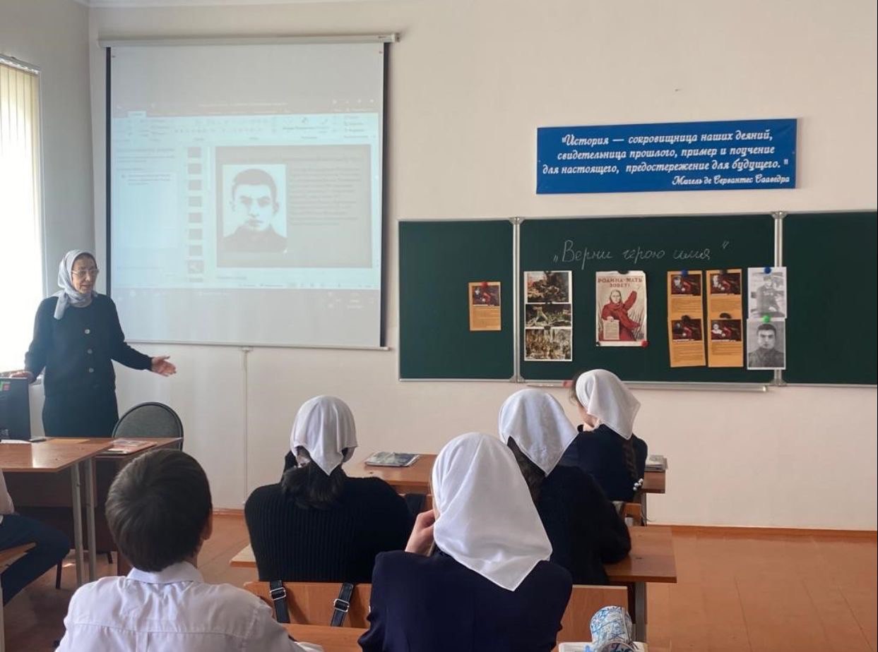 А педагогом по ДНВ Мухдановым А.Б. во всех классах была организована беседа на тему «Духовный лидер и наставник, ушедший непобежденным». Школьникам рассказали о великом подвиге Первого Президента ЧР, Героя России Ахмата-Хаджи Кадырова, который ценой собственной жизни спас свой народ от неминуемой гибели.
