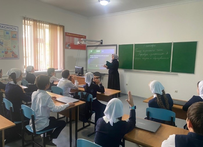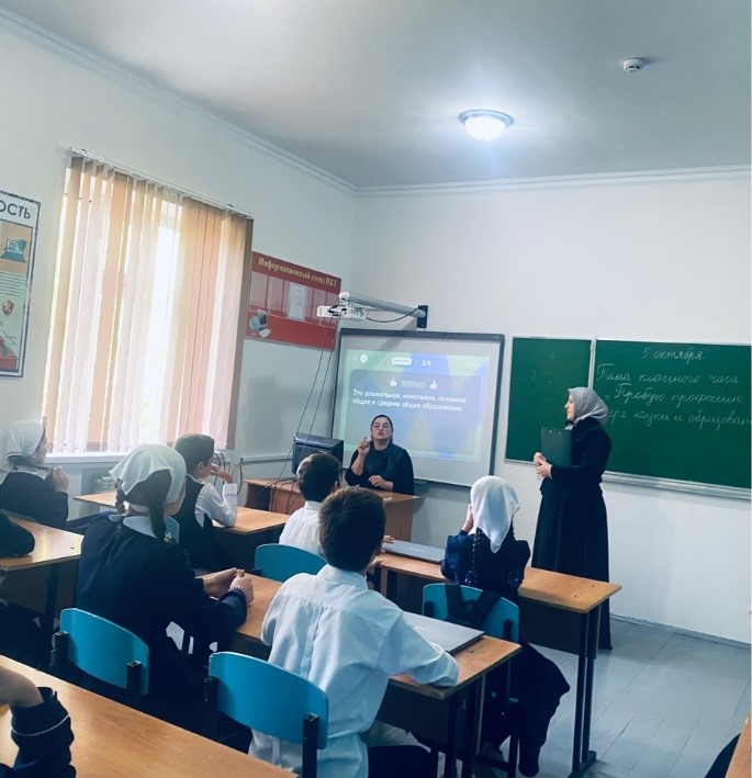 В МБОУ «СОШ № 9 с. Ачхой-Мартан» прошло занятие профориентационного курса «Россия – мои горизонты», посвященное профессии учителя по теме: «Пробую профессию в сфере науки и образования»