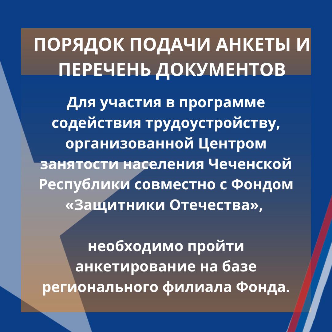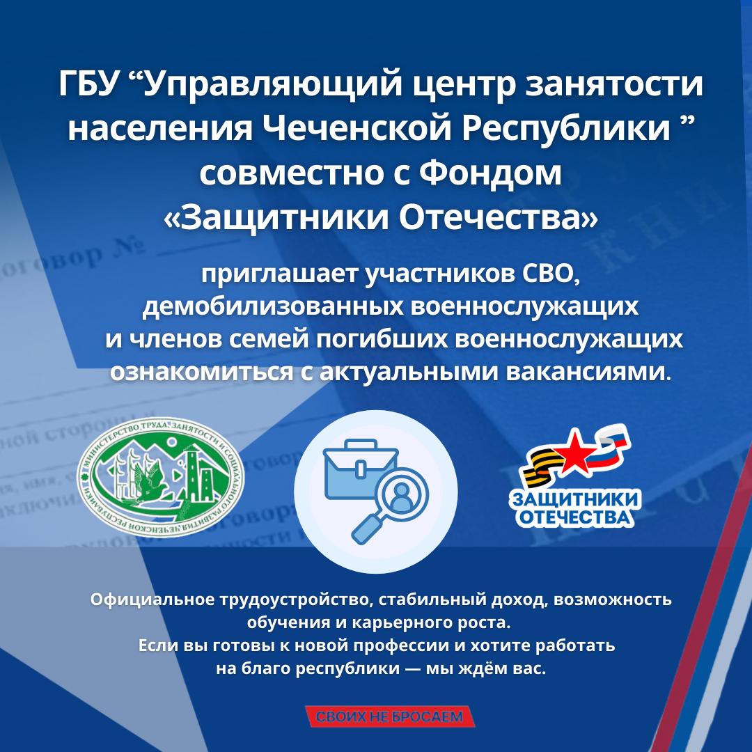 29.09.2025Филиал Государственного Фонда поддержки участников специальной военной операции «Защитники Отечества» в Чеченской Республике совместно с Государственным бюджетным учреждением «Управляющий Центр занятости населения» Министерства труда, занятости и социального развития ЧР объявляет о проведении мероприятия по содействию трудоустройству ветеранов СВО, демобилизованных военнослужащих и членов семей погибших защитников Отечества.
